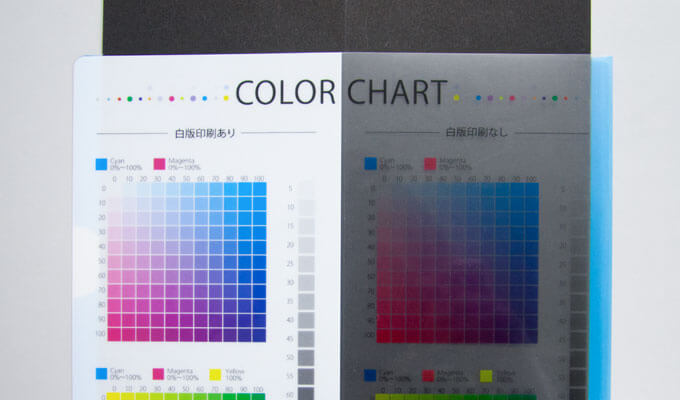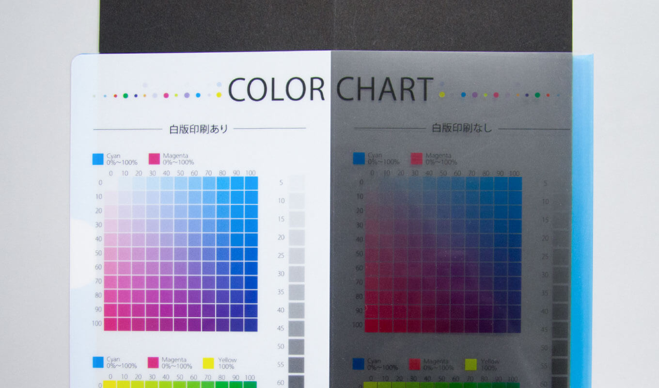 クリアファイル印刷(箔押しクリアファイルを除く)は、4色のプロセスカラーと白インキの5色から印刷されます。