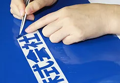 カッティングシート(切り文字部分)がしっかりアプリケーションシートに圧着されているか確認してください。細かな文字・点や線など特に注意してご確認ください。