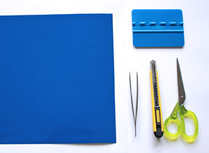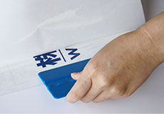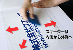貼り合わせたシートをスキージーを使いしっかり圧着します。気泡を追い出すように、スキージーは、内側から外側に向けて動かすのがポイントです。