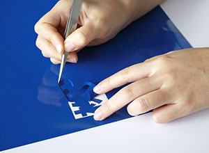 カッティングシートは文字・デザインに沿って切れ目のみ入った状態です。剥離紙より不要な部分を剥がしていきます。