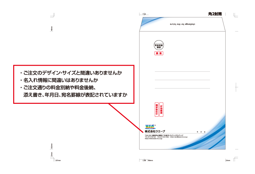 - ご注文どおりの料金別納や料金後納、添え書き、年月日、宛名罫線が表記されていますか?
