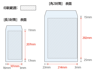 封筒印刷(刷込)は既製封筒(長3・角2サイズ)の表面に印刷いたします。フタ(入れ口)の部分、裏面には印刷できません。またフチなしでの印刷はできません。(右図参照)