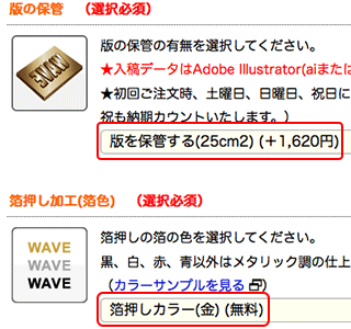 ご希望の箔押し面積(25㎠・50㎠)の料金表から、STEP3オプション選択画面にて「版の保管の有無」と「箔色」をお選びいただけます。