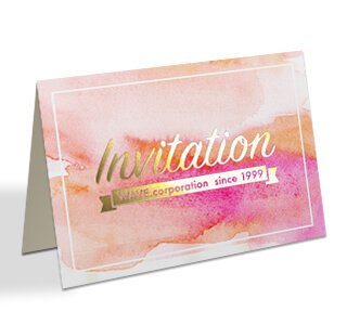 箔押しカード印刷は、箔押し加工とオフセット印刷がセットになった商品です。A7~A3サイズ(定型/変型)カード内に、25㎠・50㎠の範囲で箔押し加工を施します。8種類ある箔からイメージにあった箔色をお選びいただけます。