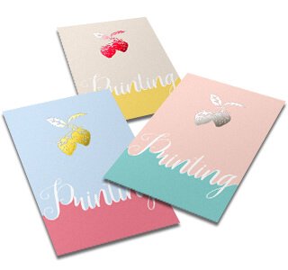 名刺印刷、 はがき/ポストカード印刷、カード/厚紙印刷を含め様々な商品に箔押し加工オプションを追加できます。最大1250cm2までご対応可能です。