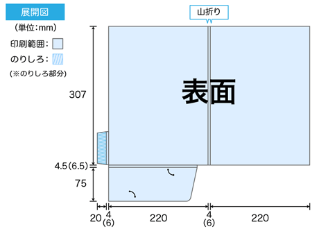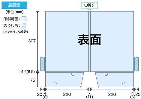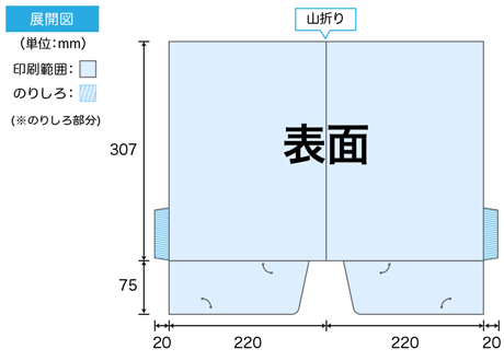 | マチ付き | マチ部分を組立て・糊付け後、見開いた状態で納品 | |