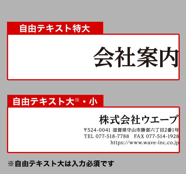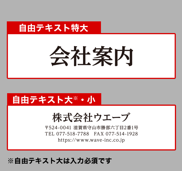 | 自由テキスト大 ※ | 全角20文字またはロゴマーク | 株式会社ウエーブ |