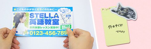 冷蔵庫などの家電製品やホワイトボード、黒板などにピタッと貼り付けられるマグネットは、販促物やノベルティグッズなどによく用いられる印刷物です。カレンダーや広告、連絡先などをプリントすることで営業活動時に活躍します。また、形を自由にカットすることもできますので、学校教材やキャラクターグッズなど、幅広い用途で活用していただけます。
