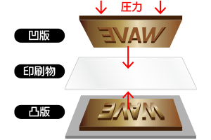 エンボス加工は、浮き出し加工とも呼ばれます。凹状の型と凸状の型の間に紙や印刷物を挟み、圧力を加えることで、紙の表面を凸状に浮き上がらせる加工技術です。弊社では金属製の型を使用しています。