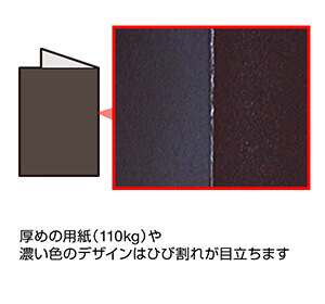 - 厚めの用紙(110kg、135kg)や濃い色のデザインの場合、折り加工部分のひび割れが目立ちます。 紙割れについての注意点
