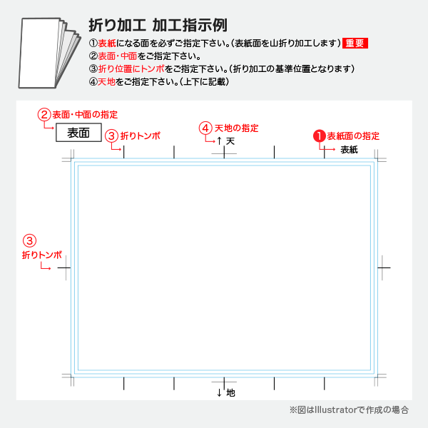 データは見開きの状態で作成し、折り加工の位置が分かるようご指示ください。