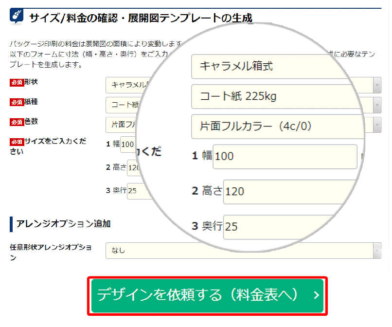 - ご希望のパッケージ形状の商品ページより、寸法を入力して、テンプレートを入手してください。