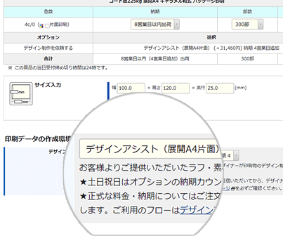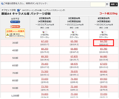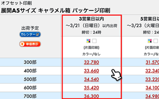 - テンプレートを配信したメールのURLより、該当の料金表へ移動。ご希望の部数・納期を選択し、ご注文完了まで進んでください。