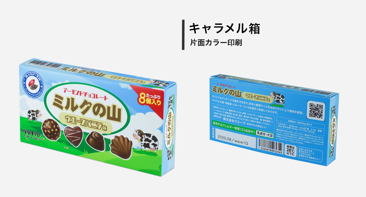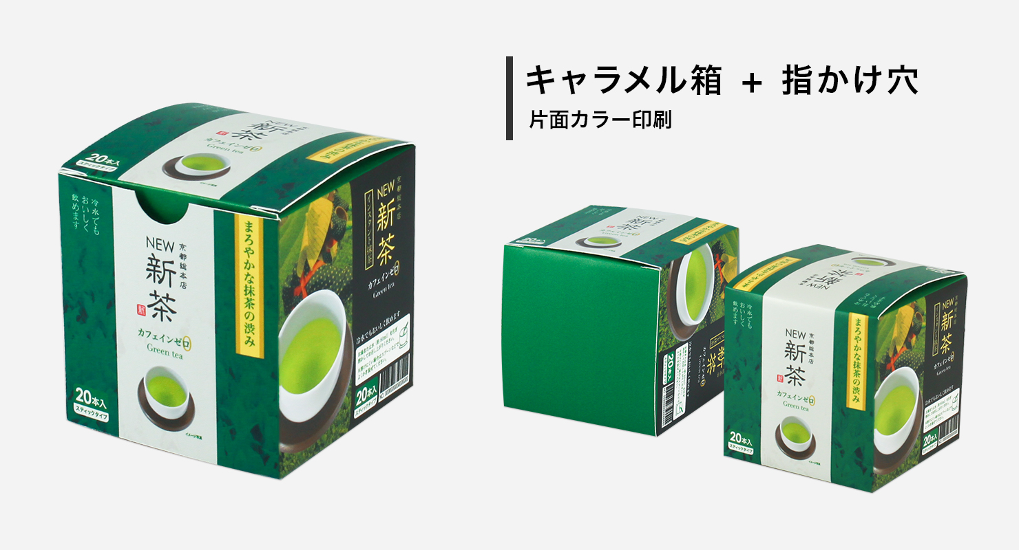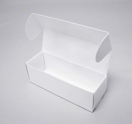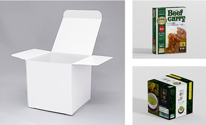 | キャラメル式箱 | 最もベーシックな形状で、レトルトカレーやティーバッグなど食品のパッケージや衣類、食玩、製品梱包用の箱など、軽量の内容物を入れる際に使われています。 指かけスリット、指かけ穴の加工をプラスすることで指がかかりやすくなり、フタが開けやすくなります。また、吊り下げフックの加工を追加すると、商品を吊り下げてディスプレイすることができます。 |