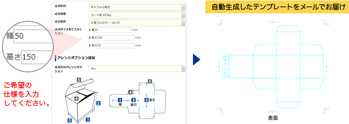 ご希望の完成サイズを入力するだけで、無料でオリジナルのテンプレートを自動生成いたします。展開図データに沿ってデータを作成するだけ!データの作成もラクラクです。