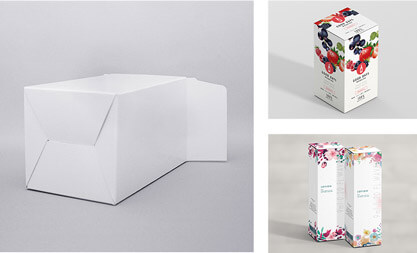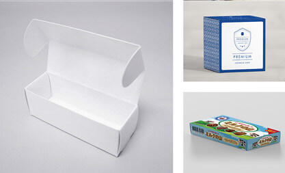 | 地獄底式 | キャラメル箱式と並び人気のパッケージです。キャラメル箱より内容物は重めの物でも耐えられます。化粧品、玩具、お菓子など様々な商品を入れることができます。 差し込みロックの加工を追加すると、しっかりとフタ部分を閉めることができます。コンタクトレンズや医薬品などの商品を清潔に保つことができます。 |