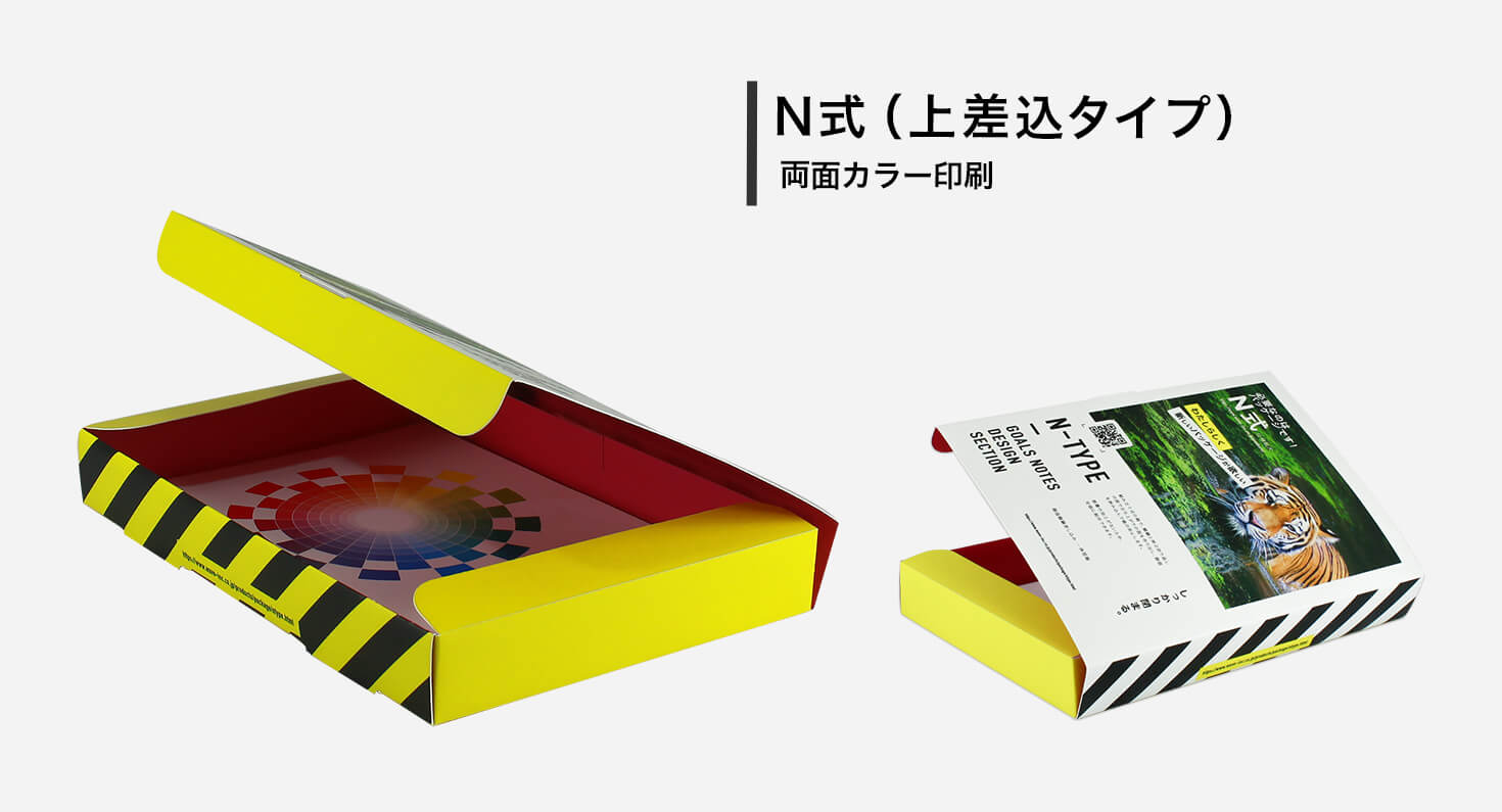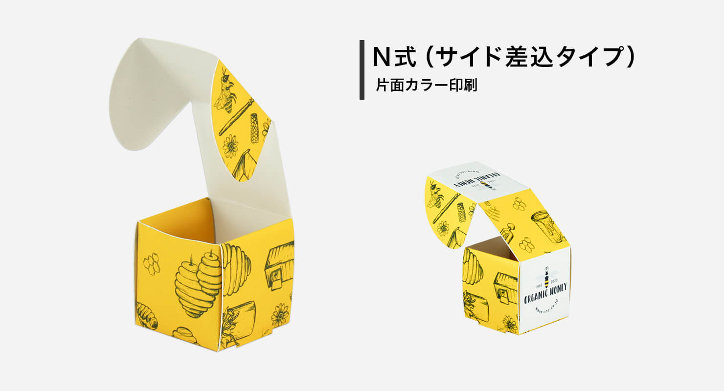 | N式 | 側面でフタを閉じるため、仕上がりも美しく開封性・梱包性に優れた箱です。焼き菓子や個包装の食品、試供品、ミールキットなどの商品入れることに適しています。また、フリマアプリなどで人気の配送サービスに使える、高さを抑えた平らな箱も作成可能です。 |