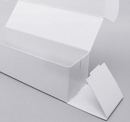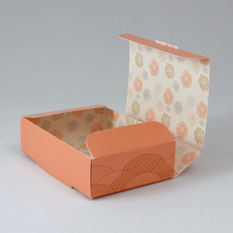 フタと本体が一体構造の組み立て式の箱です。接着の加工がないため、安価に製作できます。