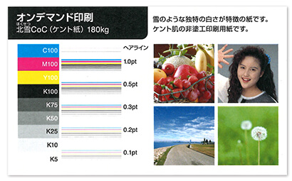 北雪CoC(ケント紙)は、表面の平滑性(なめらかさ)と白さを求めた紙です。高白色のケント紙の代表とも言える用紙で、デザイナーからも高い支持を得ています。