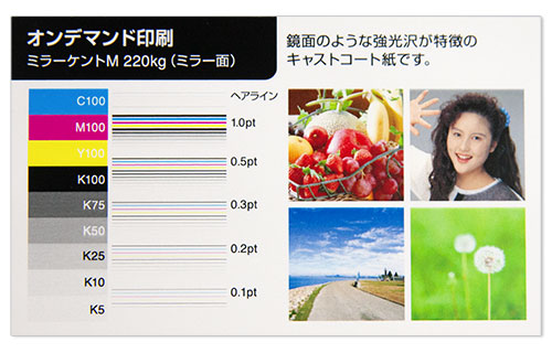 | 220kg | 約0.270mm | 約1.9kg(はがきサイズ) | しっかりとした紙厚で、ミラー面の発色は抜群です。写真やイラストを生かしたポストカードやDM(ダイレクトメール)にオススメです。スタンプカードにもご利用いただけます。 ミラーケントMのおすすめ用途 |