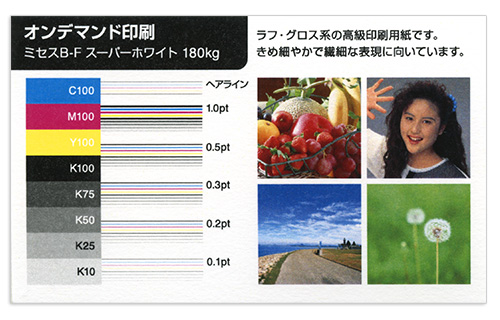 ミセスB-F スーパーホワイトとは、しなやかな腰、緻密な肌をもつ風合い豊かな高級印刷用紙です。表面がきめ細やかで平滑性が高くさらさらとした手触りで、繊細な表現を得意とします。「スーパーホワイト」はミセスB-Fシリーズで最も白色度が高い用紙です。