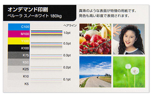 - 用紙の持つパールトーンを活かし、デザイン・美容関連の印刷物へのご利用に適しています。