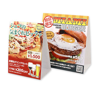 卓上POPは卓上において利用されるPOP広告で、一般的には立体的な形状のものを言います。設置するだけで、高い販促効果が見込めます。