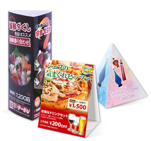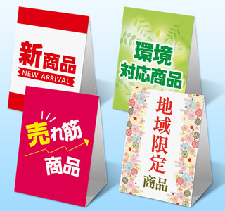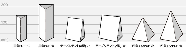 三角POP、テーブルテント、四角すいPOPの3タイプをご用意。サイズはそれぞれ大小からお選びいただけます。