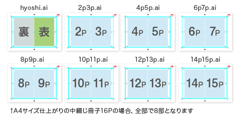 例)A4仕上がりの16ページ冊子の場合、簡易校正は8枚でご注文となります。(左図)