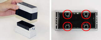 スタンプのグリップと印面部をそれぞれつかみ、取り外してください。印面部の中にインクの補充口が確認いただけます。