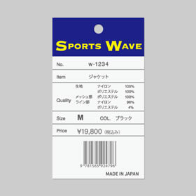 商品タグは、価格や仕様、販売元情報などを印刷して、商品に取り付けるタグや下げ札などとして活用する印刷物です。商品のサイズや価格、商品ID、ロット番号、JANコード(バーコード)、素材、洗濯マーク、製造会社名などの商品に関する様々な情報が記載されています。
