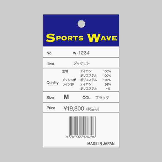 例えば衣料品には複数の商品タグがついています。値札タグや、洗濯マークの書かれた洗濯ラベル(品質表示タグ)といった販売の際に必要な情報のほか、ブランディングに沿ってデザインされたブランドネームタグや、機能性をアピールする内容のタグがあります。