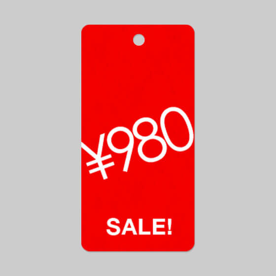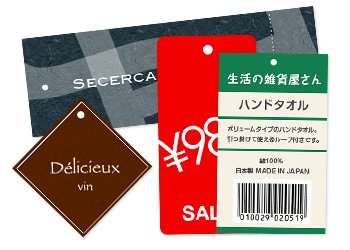 また、商品タグには紐を通すための孔が開けられているものが多く見られます。さらに、商品を傷つけないように紙片が角丸加工されているものも見られます。