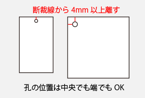 断裁線から孔までの距離を4mm以上離していただければ、どの位置でも孔開けが可能です。