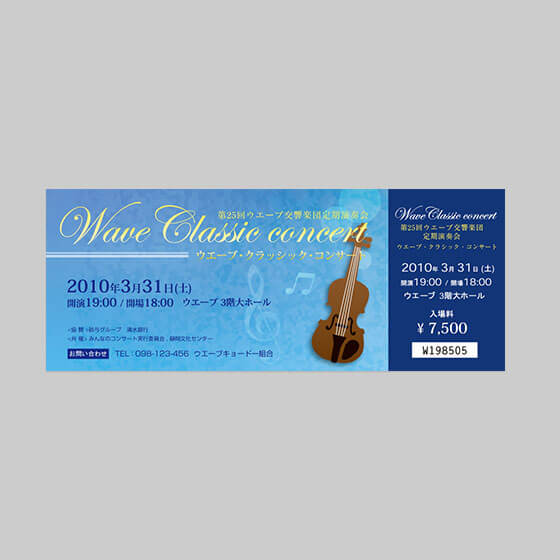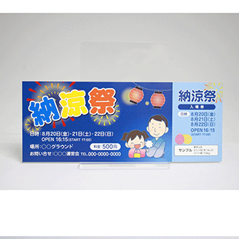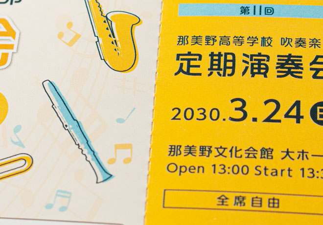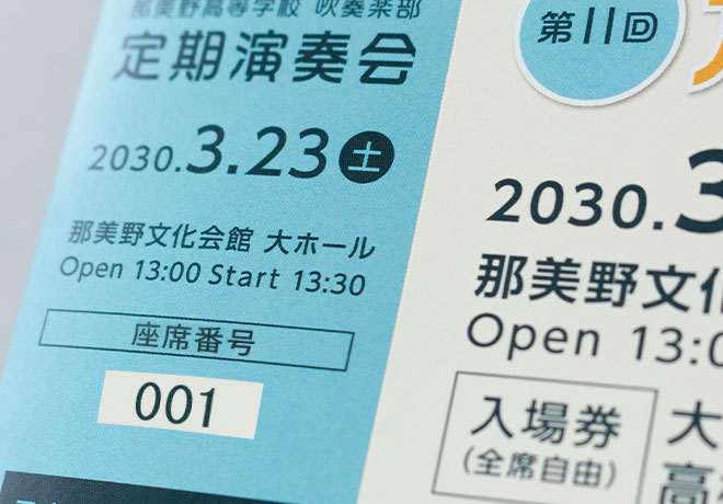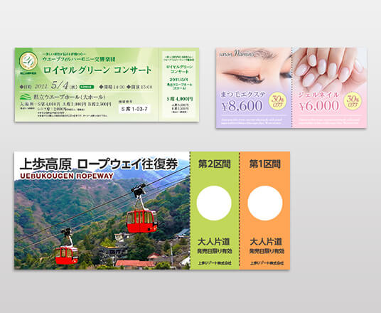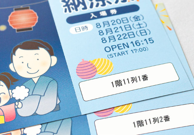 コンサートやライブ、演劇、講演会をはじめ、各種イベントで活用されているチケット。半券を切り取りやすいように、ミシン目付きでの印刷が可能です。