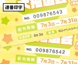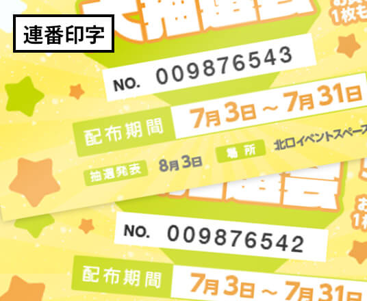 はい、可能です。チケット印刷をご注文の際に、オプションで「連番印字」をお選びください。例えば、「1〜100」、「0005〜0105」といったような連番の印字が可能です。連番の前に「No.」の文字を追加することもできますし、フォントのサイズもお選びいただけます。