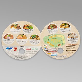 2つ折り・3つ折りできる連結タイプの円形うちわ。複数面に印刷が可能なので、多くの情報を掲載できます。イベントのプログラムとしても利用できます。 |