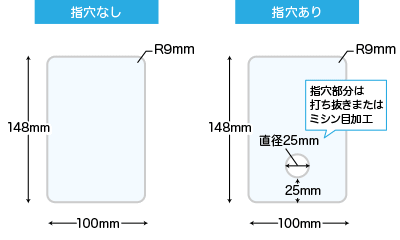 - 製造工程の特性上、指穴が抜かれている部分・ミシン目部分の加工位置に若干のずれが生じる場合があります。塗り足し、文字切れなどには十分にご注意ください。