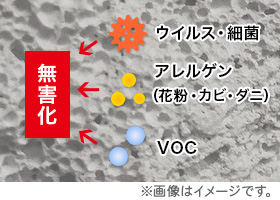 漆喰をコーティングした壁紙です。消臭効果、抗菌・抗ウイルス作用、VOC除去機能(シックハウス症候群の原因となるホルムアルデヒドを分解)、結露の抑制など多くの機能をもちます。